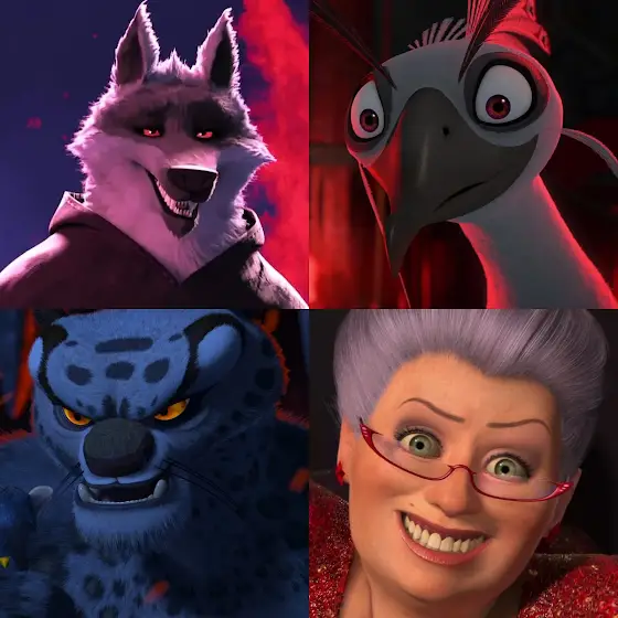 Mis cuatro villanos favoritos provenientes de los estudios de animación que más me gustan:🌙DREAMWORKS ANIMATION🎣:🐺Lobo La Muerte💀 🐱Gato con botas: El último deseo👢🦚Lord Shen🎇 🐼Kung Fu Panda 2☯️🐆Tai Lung📜 🐼Kung Fu Panda🐲🧚🏻♀️Hada Madrina✨ 🧅Shrek 2♥️🔦PIXAR ANIMATION STUDIOS🚀:🦗Hopper🏜️ 🐜Bichos: Una aventura en miniatura🎪🦹Síndrome🤖 🦸Los Increíbles🧑🧑🧒🧒🧸Lotso Cariñoso🏫 🤠Toy Story 3🧑🚀🕷️Henry J. Waternoose III🏭 👹Monsters, Inc.👁️🐭WALT DISNEY ANIMATION STUDIOS🏰:👿Chernabog⛰️ 🐭Fantasía🧙⚖️Juez Claude Frollo⛪ 🔔El jorobado de Notre Dame🔮🦁Scar👑 🦁El rey león🌍🦹Hades🔥 🏺Hércules🇬🇷🐻SONY PICTURES ANIMATION🧛:👔Kingpin🧑🧑🧒 🕸️Spider-Man: Un nuevo universo🌃🕷️Miguel O'Hara🧑🧒 🕸️Spider-Man: A través del Spider-Verso🌆🐧Tanque Evans🏆 🐧Reyes de las olas🏄🛻Shaw🏞️ 🐻Open Season: Amigos salvajes🦌🧟LAIKA🐈⬛:🌙Raiden el Rey Luna🪱 🏯Kubo y la búsqueda Samurai⛩️🤱🏻La otra madre/La Beldam🪲 🙋🏻♀️Coraline y la puerta secreta🚪🙍🏻♀️Aggie Prenderghast👻 🧒🏻ParaNorman: Una historia de fantasmas, brujas y una maldición👻🎩Archivaldo Hurtado🧀 📦Los Boxtrolls🥚🐿️BLUE SKY STUDIOS🌰:💰Killian🤖 🕵🏻Espías a escondidas🕊️🦜Pepillo📺 🦜Rio🇧🇷🤖Madame Engrane🏭 🤖Robots🔧🐯Soto🚼 🧊La era de hielo🦣