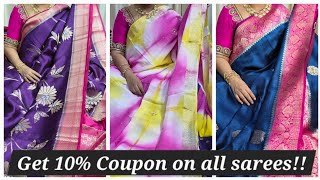 GET 10% COUPON ON ALL SAREES| BAANDINI,KHADI CHANDERI SAREES |DRESS MATERIALS |GIVE AWAY| 8688637474