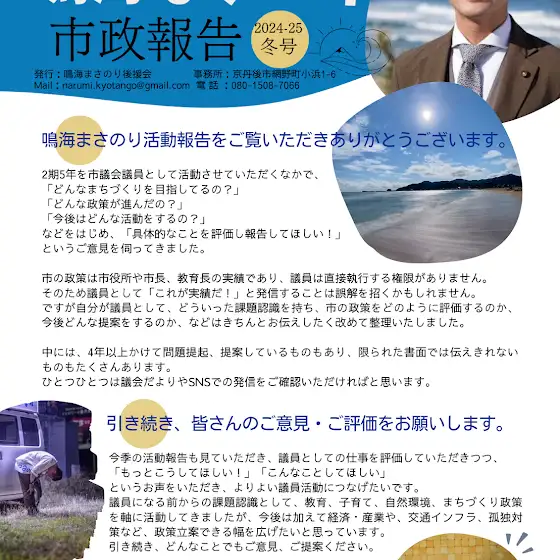 【成長したかった2024】2期5年を市議会議員として活動させていただくなかで、「どんなまちづくりを目指してるの?」「どんな政策が進んだの?」「今後はどんな活動をするの?」などをはじめ、「具体的なことを評価し報告してほしい!」というご意見を伺ってきました。市の政策は市役所や市長、教育長の実績であり、議員は直接執行する権限がありません。そのため議員として「これが実績だ!」と発信することは誤解を招くかもしれません。ですが自分が議員として、どういった課題認識を持ち、市の政策をどのように評価するのか、今後どんな提案をするのか、などはきちんとお伝えしたく改めて整理いたしました。今季の活動報告も見ていただき、議員としての仕事を評価していただきつつ、「もっとこうしてほしい!」「こんなことしてほしい」というお声をいただき、よりよい議員活動につなげたいです。議員になる前からの課題認識として、教育、子育て、自然環境、まちづくり政策を軸に活動してきましたが、今後は加えて経済・産業や、交通インフラ、孤独対策など、政策立案できる幅を広げたいと思っています。引き続き、どんなことでもご意見、ご提案ください。2024年 京丹後市は市政発足20周年を迎えました。これまでを振り返ることも大切です。しかし、これから先の数年は今までより一層、直面する課題は深刻です。例えば人口構造の問題。2040年には、人口は3.5万人、後期高齢化率30%、そしてその時の京丹後市民の人口のボリュームゾーンは90代の女性になると推計されています。現役世代の割合が大幅に下がっていくことで、地域のさまざまな機能が「今のままでは」維持できなくなるでしょう。すでに、若い人たちは消防団や祭、各種の役員などの「今の」自治活動に限界を感じています。仕組みとしての「今のまま」を変えていくことで、元気な地域を創っていく必要があります。そのためには、市をあげた議論が必要であり、多様な市民のみなさまの声を背負って市議会で議論することが不可欠だと痛感します。~それでも京丹後のまちづくりは面白い~上記のように京丹後市がまちづくりの難易度が高いまちであることは受け止めたうえで、それでも京丹後市のまちづくりが面白いということも声を大にして言いたいと思います。このまちには、都会みたいなものはないかもしれません。しかし、都会にはないものがたくさんあります。海、里山、食、星、歴史。そして、顔の見える関係性と、困ったときに頼りあえる人と人のつながり。なにかやってみたいと思ったときに応援しあえる仲間がいること。みなさんの周りでもどなたかの顔が思い浮かぶのではないでしょうか?もちろん後ろ指をさされることもありますが、その声よりも励まし合える声が大きいのが、京丹後市のまちづくりの強さだと信じています。2025年も引き続き頑張ります!