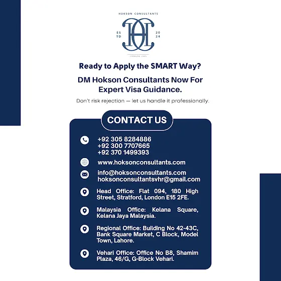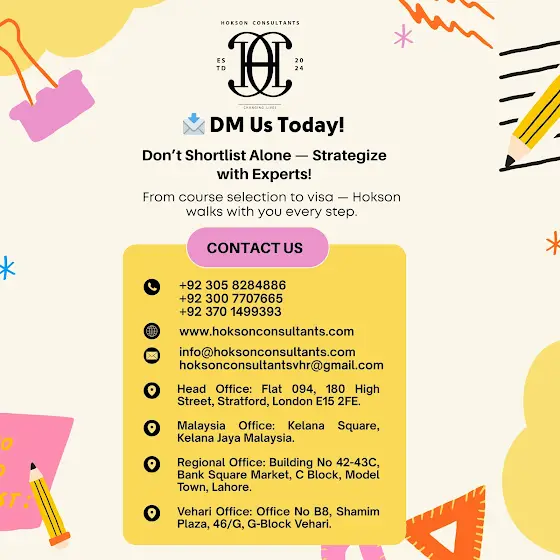 🚀 Your future won’t wait. Step into it today with Hokson Consultants — your trusted partner in global education. 📱 +92 305 8284886 | +92 300 7707665 | +92 370 1499393 🌐 www.hoksonconsultants.com
