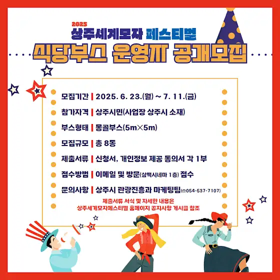 <2025 상주세계모자페스티벌 식당부스 모집>📅 모집기간: 6. 23.(월) ~ 7. 11.(금)📍 운영기간: 9. 26.(금) ~ 9. 28.(일)⏰ 운영시간: 10:00 ~ 21:00🏠 대상: 상주시민 (사업장 상주 소재)⛺ 운영형태: 몽골부스 (5m × 5m) / 총 8동📝 제출서류: 신청서 + 개인정보 제공동의서 (각 1부)📂 다운로드:www.sangju.go.kr/swhf/ (축제 홈페이지)📬 접수방법이메일: sangjufe@gmail.com방문: 상주시 삼백로 327-9 (상주농업농촌테마공원)📞 문의: 관광진흥과 마케팅팀 ☎ 054-537-7107