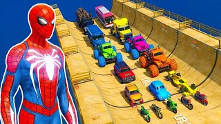 SPIDERMAN CARS Racing Challenge on MULTI Rampa ! SUPERHERO HULK Goku Motos BIKE JET SKI Race - GTA 5