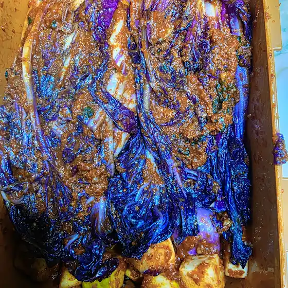 적색배추로 김치담그기 ㅋ 김치 양념소가 남아서 보라배추가 신기해서 담궈봄 맛은 배추랑 똑같다😍색이 ㅋㅋㅋㅋ 재밌어요