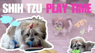 Shih tzu playing with toy, slippers and bottles!!