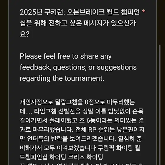 긴장도 많이 했고 이상한 사고도 많았지만(??) 어찌저찌 4강까지 올라가 즐겁게 게임한거같습니다쿠크시님 본선도 화이팅~ 점프길드 화이팅~데브시스터즈 감사합니다!!! 덕분에 귀한 경험 해봤습니다🥳