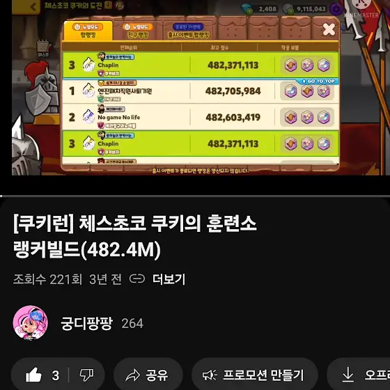 랜숭이근황) 4일동안 크탈 7만개정도 썼고요요령이 생겼는지 판마다 170억라인은 꾸준히 뽑히는데 그 위로는 안올라가지네요. 어렵다 랜챌!그저껜가 용사만!떴으면 현재 최고기록(1200억)은 넘어볼만한 판 한번 있었는데 커먼커먼에픽에픽에픽에픽커먼레전뜨고 망했읍니다....앞주자에서 레어 잘빼놨더니 레어자체가 안나와버리는 마법?-?-?요즘 쿠키런켜면 랜챌만 했는데 슬슬 꺾이네요 흑흑흑흑흑흑흑흑흑흑흑슨슨슨대충 3만크탈만 더 써보고 ? 이번시즌은 마감해보겠습니다한판만에 용사 900억을 찍어버리니 제 운빨을 과대평가했던게 아닌가 싶네요 ㅋㅋㅋㅋ