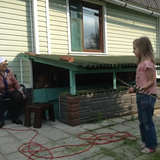 Дача в июне 2016г , когда всё заросло из-за оперативного лечения матери, никто не работал на даче, и вот мы приехали и Аня помогала убирать траву. Вот можно наглядно увидеть, какая трава (газон ) была при матери, и какая сейчас растёт у меня( сорняки, одуванчики). Что она делала, я не знаю 🤷