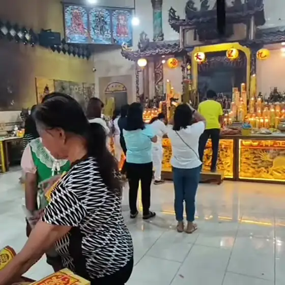 Kiu Ong thai thei 2025 人们在寺庙中向神灵祈祷,并在寺庙前院焚烧神灵屋的复制品。 闽南语传统