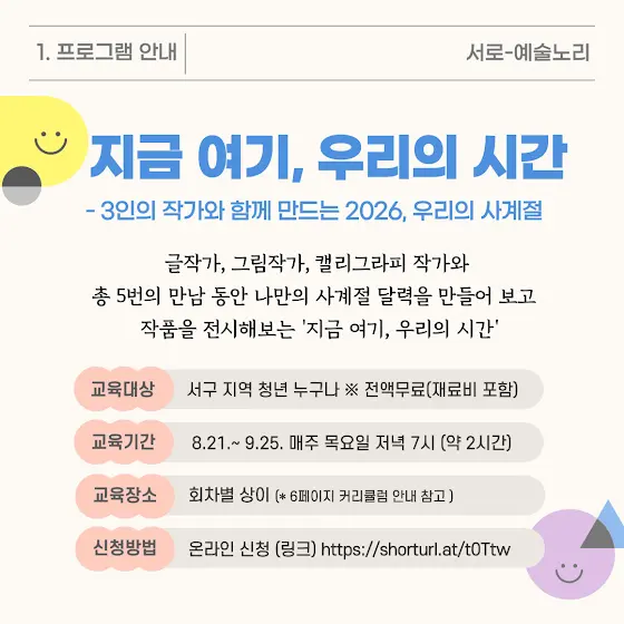 📌 모집 대상: 서구 지역 청년 누구나 (만19세-만39세까지) 📌 참가 비용: 전액 무료 (재료비 포함) 📌 교육 기간: 25.08.21. ~25.09.25 매주 목요일 저녁 7시 (약 2시간) 📌 교육 장소: 회차별 상이 (*커리큘럼 안내 참고) 📌 작품 전시: 청라블루노바홀 전시장 내 작품 전시 (10월 중순) 📌 작품 배포: 2026년 달력 온라인 공공배포 (재단 홈페제이지 등) 📌 신청 기간: 25.07.25.(금)~25.08.13.(목) 자정까지 📌 신청 방법: 온라인 참가 신청 shorturl.at/Nwveg