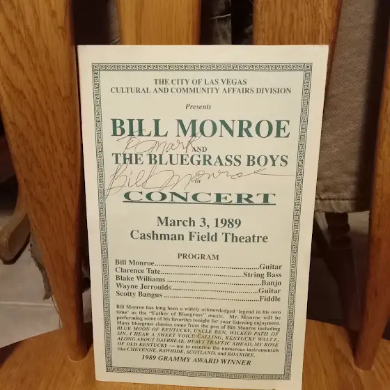 We love getting emails like this one from Mark (pictures included): “The video you posted today the 16th got me thinking so I did some digging and came up with this flyer. Photo included. After the show bill announced he would give autographs. So I got in line as he stood on stage he laid his mandolin out flat upside down and signed this on the back of it. I miss the days me and Dad would go back to Alabama and see bluegrass shows. Great times. Just found your channel and subscribed within the last week. Top notch content. Mark.”