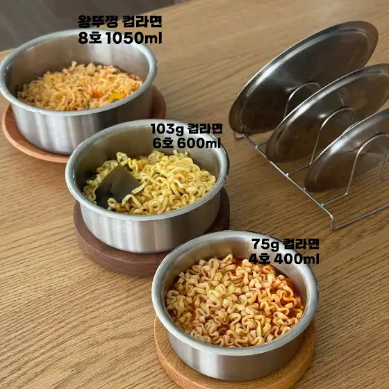 ✔️ 1호 : 150ml (요거트 하나정도 사이즈) ✔️ 2호 : 250ml ( 1, 2호는 편마늘 또는 쌈장 담기 좋음 이유식 먹는 아이들 이유식 담기좋음 ) ✔️ 3호 : 330ml ✔️ 4호 : 400ml (75g 짜리 컵라면) ✔️ 5호 : 550ml ( 3, 4, 5 호는 3~4인 한두끼 반찬 담기좋음 달걀양에 따라 달걀물 만들 때 좋음 ) ✔️ 6호 : 600ml ( 두부 300g 짜리 담기, 103g 짜리 컵라면) ✔️ 7호 : 1000ml ✔️ 8호 : 1050ml (왕뚜껑라면, 소스대용량 담기) ✔️ 9호 : 1600ml(쌀씻기, 어묵 1kg) ( 7, 8, 9 호는 많은 양의 반찬담기, 냉국, 고기재우기 )