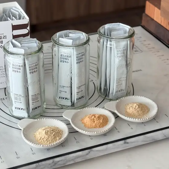 저는 멸치로 육수 낸 후에 분말육수 1포 정도로만 맛을 끓어올리는 용도로 사용하다 빠른시간 밥을 차려내야하는 시간에는 700ml 물에 분말육수 2~3포 넣고 국을 끓이는데 국물의 깊은맛이 멸치똥따서 국물낸 맛보다 더 깊더라고요 그 이후부터는 모스분말육수가 저희집 주방 깊숙하게 계속 자리잡고 있죠