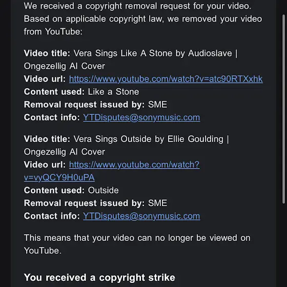 Following the removal of two of my Ongezellig AI Covers due to copyright and the consequent email from YouTube presented to you below, I have decided to take down all my Ongezellig AI Covers to avoid the complete termination of my channel as I am one copyright strike away from doom. I also don’t want to have to make a second account and re-upload them there, so while it pains me to say it, they will be gone for the greater good. This however is not the end for me, I promise to all of you that I will continue uploading content of some sort even if I can’t post more AI Covers. I do not intend on going anywhere, so you don’t have to worry about losing another member of the Ongezellig community. I once again encourage all of you to follow me on Instagram, the username is the same as my username here (@mymyswereld or Mymy’s World) and the link is provided on my about page as well. And if you are interested, you can message me there and I will provide you with the original videos of the AI Covers for you to either keep personally or even re-upload under your own risk if you so wish. Crediting me will not be necessary but greatly appreciated. Thank you all for your patience and understanding, but most importantly for your support throughout the past months, this has been a very special year for me and unless I upload anything else before the year ends I hope you also had a great 2025 and I will see you in 2026!
