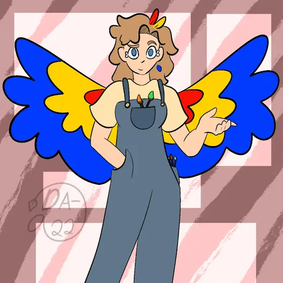 Her name is Makenna but she goes by Mak, she lives on a small trading port on the sea. She works as a painter. Ever since she was young she has been especially good at mimicking other’s voices. Her bird “half” is a Scarlet Macaw!