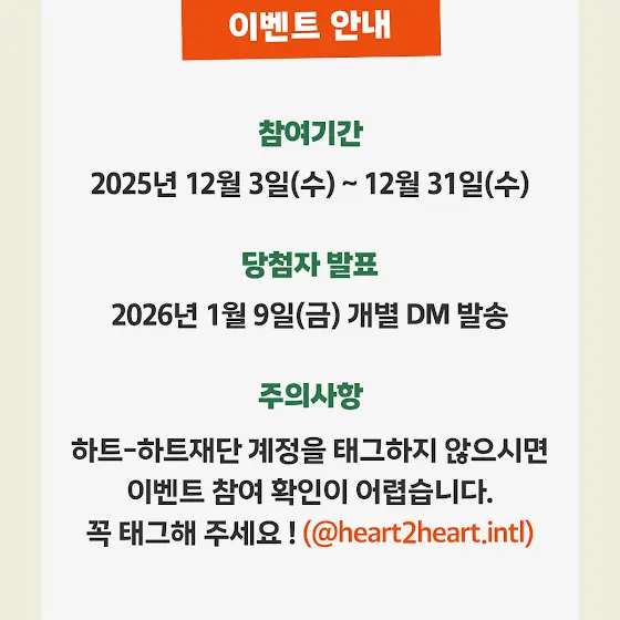 하트-하트재단 계정 태그 (@heart2heart.intl) 를 꼭 해주셔야 이벤트 참여가 완료됩니다.