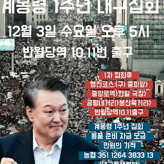 이번 10월 3일은 보수&우파가 하나로 뭉치는 날입니다. 뭉쳐아 하는 날입니다. 광화문에서 용산까지 행진하십시다. 북 3000개(300~3000)를 두드리면서... 이재명 정권에 항복을 받아냅시다. 10월말 안으로 윤셕열 대통령을 석방 시킵시다. 광화문 애국집회에 장동혁 당대표, 김민수 최고의원, 전한길 강사, 김성원씨(그라운드 씨)와 학생들을 연사에 세우고... 국본! 자유와 혁신 국민투쟁본부! 우리 공화당! 자유 민주당! 위헌정당 해산 국민운동 본부! 자유대학! 안정권 대표! 김상진 대표! 세이브 코리아! 고교 연합! ROTC! TKYC! Freeism! 부방대! 서버까 국민운동 본부! ... 대구 구국 투쟁본부까지 대한민국 모든 애국 단체들은 10월 3일 광화문 애국집회에 총집결 하십시다. 이것은 부탁이 아닙니다. 호국영령들의 준엄한 명령입니다.