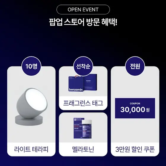 팝업스토어 OPEN!벤자민AI가 현대백화점 목동에 팝업스토어를 오픈합니다!벤자민AI가 궁금하셨던 모든 분들, 팝업스토어에서 편하게 체험하고 다양한 이벤트와 구매 헤택도 놓치지 마세요!01. 방문만 해도! 🏨 5성급 호텔 숙박권 (1명) ☀️ 벤자민AI 라이트테라피 (10명) 😴 벤자민AI 식물성 멜라토닌 (선착순) 🎁 벤자민AI 프래그런스 태그 (선착순) 💶 3만원 할인 쿠폰 (전원)02. 현대백화점 팝업 단독 구매 혜택! ✨ 최대 50% 할인 💝 구매 즉시 현대백화점 상품권 😘 30일 무료 체험 🎁 방수 커버 & 매트리스 패드 증정 🛏️ 벤자민AI X LG 스페셜 패키지 구매 혜택🗓️ 기간: 05월 12일-06월 01일 (3주 간) 📍 장소: 현대백화점 목동 지하1층 *팝업 보도자료: 파이낸셜뉴스 www.fnnews.com/news/202505081146255677