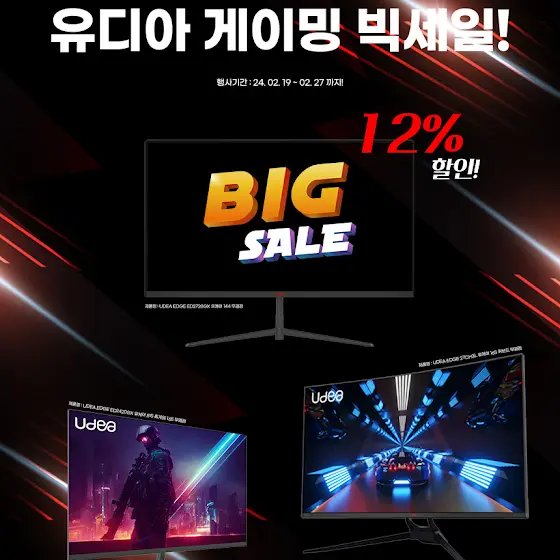 안녕하십니까, 무상방문케어 서비스 제공하는 No.1 국민모니터 유디아, 배틀을 배틀답게 배틀G 입니다. 항상 저희 유디아, 배틀G 브랜드를 사랑해주시는 많은 분들께 감사드립니다.! 🎁현재 유디아, 배틀G는 옥션, G마켓에서 빅스마일데이 할인 이벤트를 진행하고 있습니다.!🎁 이벤트 기간 ~ 24. 05. 07(화) 부터UDEA EDGE ED2731HF 유케어 VA 홈엔터 100 화이트 무결점 지마켓 : item.gmarket.co.kr/Item?goodsCode=3613101725 옥션 : itempage3.auction.co.kr/DetailView.aspx?itemno=E23… UDEA EDGE ED2731HF 유케어 IPS 홈엔터 100 화이트 무결점 지마켓 : item.gmarket.co.kr/Item?goodsCode=3613237142 옥션 : itempage3.auction.co.kr/DetailView.aspx?itemno=E23… UDEA EDGE ED2431HF 유케어 IPS 홈엔터 100 화이트 무결점 지마켓 : item.gmarket.co.kr/Item?goodsCode=3613245173 옥션 : itempage3.auction.co.kr/DetailView.aspx?itemno=E23… 위 3종은 ~ 05. 09(목) 까지! BattleG BG34CU 유케어 165 커브드 게이밍 리미티드 에디션 무결점 지마켓 : item.gmarket.co.kr/Item?goodscode=3707390599 옥션 : itempage3.auction.co.kr/DetailView.aspx?itemno=E32… UDEA EDGE ED2731HQ 유케어 IPS 홈엔터 QHD 무결점 지마켓 : item.gmarket.co.kr/Item?goodscode=3441342899 옥션 : itempage3.auction.co.kr/DetailView.aspx?itemno=D84… UDEA EDGE ED2741CPF 유케어 180 커브드 홈게임 지마켓 : item.gmarket.co.kr/Item?goodscode=3745884858 옥션 : itempage3.auction.co.kr/DetailView.aspx?itemno=E36… 위 3종은 ~ 05. 20(월) 까지!