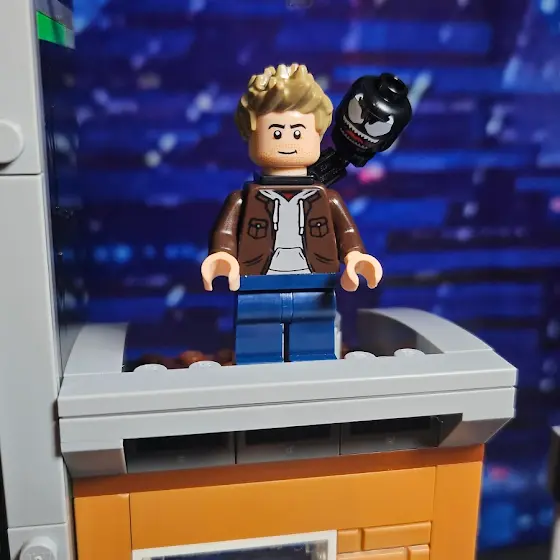 A month or two ago, Blue got us an Oscorp Lego set, which came with a small apartment for Eddie Brock, along with this movie/comic inspired minifigure, complete with symbiote head.