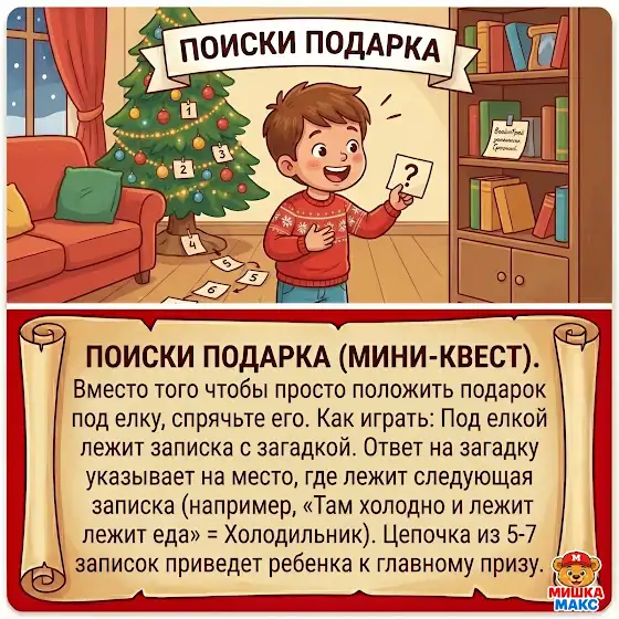 Родители могут спрятать подарок, а ребёнку — дать карточки-подсказки.