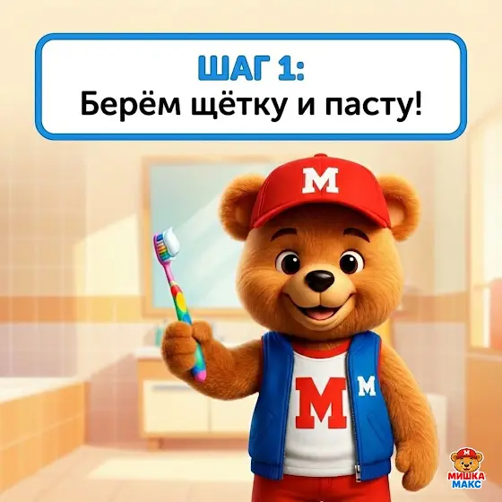Мишка Макс учит малышей правильно чистить зубки — простое видео с полезным правилом для ежедневной привычки.