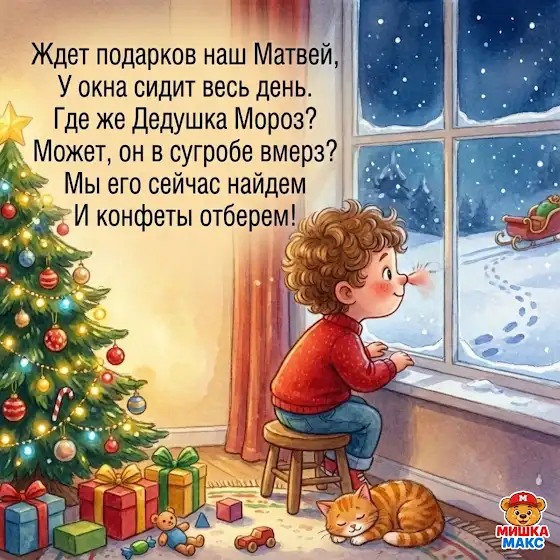 Мишка Макс придумал тёплую зимнюю историю с волшебством, приключением и праздничным настроением.