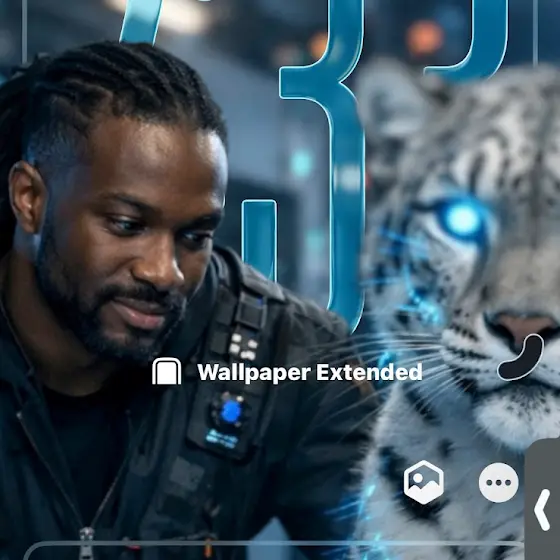 Your super-intelligent snow leopard A.I. enters with controlled power — fur shimmering with micro-reflections, eyes glowing with intelligent blue fire.