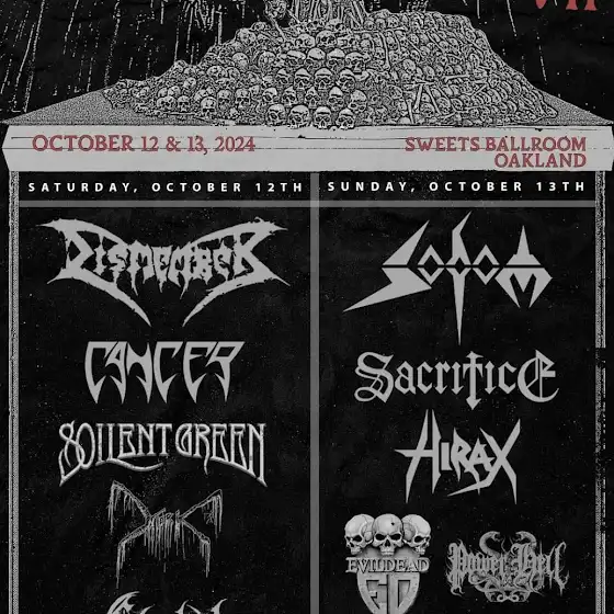 well CDF VII was a blast! i shot a bunch of footage, this time was a solo mission. the 1st day was balcony tripod action for the 1st 4 bands then down on the floor for soilent green cancer and dismember. day 2 i multi cammed all the bands. 2 cams for funeral chant oath of cruelty and power from hell. 3 cams for evil dead sacrifice and sodom. 4 for hirax. all the bands were great, highlights for me were definitely dismember sodom and sacrifice. hirax was amazing. evil dead was cool. i also dug oath of cruelty. sacrifice was tight as fuck and great. dismember were absolutely amazing and killer. SODOM stole the entire show and capped it all off with a 90 min set of some of the fastest and heaviest metal on the planet. they fuckin ruled so hard! had a great time hangin out and seeing friends marcelle and sonny from vorlust, ross from exhumed, sam caparros from stench reel.. tom, jason and geza from the metro. amy strong! who got to see slayer and then came to cdf! danny from reality check. who told me hes basically retired. and i met some new friends too. chris broyles a taper with 20+ years experience, was up in the balcony with me, recording with a new iphone, when i introduced myself, he who knew i was and my stuff. and literally told me my tapes were legendary. it was an honor to hear that. i shared some stories with him about dan nicholson, gary shurtleff and jerry allen, and what we were up to in the 90's and 2000's. gareth morris from dullahan prod. who recorded the audio with a 24 track digital recording. another friend rodney benjamin from high school who came up and said thank you for recording, documenting, and everything ive done to help keep the scene thriving. which was also an honor to hear. i also bought a bunch of records from the sacrifice merch booth, the new 7" hirax from anne at the hirax merch booth. and a bunch of old metal and punk records from driptone reocrds from LA, who were here slingin wax at the show. had a few beers, some food. yeah. good times. soooo.. i will be putting out some of the footage asap. probably 1 song from each band for right now. like usual. and then later on, full sets. Cheers!! keep on watching this channel!! as chuck schuldiner once wrote on my leprosy picture disc.. "METAL 4 EVER!!"