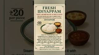 Experience the Softness of Tradition – IDIYAPPAM(Rice Noodles) Like Never Before! Delightfully Soft. Naturally Delicious. Timelessly Traditional. Discover the melt-in-your-mouth taste of Idiyappam, South India's beloved rice noodle delicacy perfectly steamed, soft, and ready to pair with your favorite side!