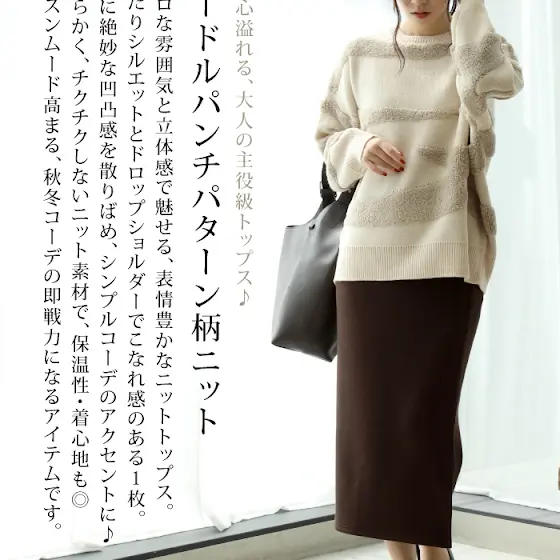 遊び心溢れる、大人の主役級トップス♪ 『ニードルパンチパターン柄ニット』 レトロな雰囲気と立体感で魅せる、表情豊かなニットトップス。 ゆったりシルエットとドロップショルダーでこなれ感のある1枚。 全体に絶妙な凹凸感を散りばめ、シンプルコーデのアクセントに♪ やわらかく、チクチクしないニット素材で、保温性・着心地も◎ 秋冬コーデの即戦力になるアイテムです! ▽紹介動画はこちら▽ youtube.com/shorts/0raya1gizq8 ▽商品はこちらから▽ bit.ly/3VKdJfF