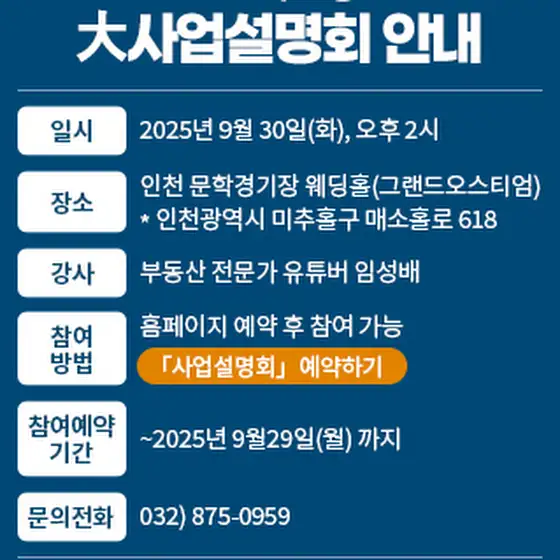 안녕하세요. 임성배입니다.2025년 이후, 부동산 시장전망이란 주제로 "인하대역 수자인 로이센트 사업설명회를 진행합니다. sujain-roicent.co.kr/event_c.html*2025년 9월 30일(화) 오후 2시무료 신청이 가능하니, 많은 참여 부탁드려요. ^^감사합니다.
