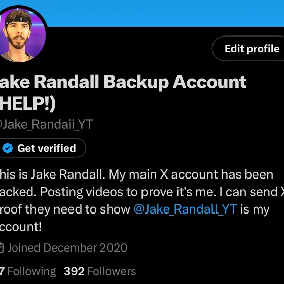 Everyone I have regained control of my YouTube account that was hijacked for 2 days! I will be making a video explaining the whole situation next week. Unfortunately I have not been able to reclaim my X account and I am using the jake_randaii_YT account pictured below as a backup while I try to get a human who works for X to help me.