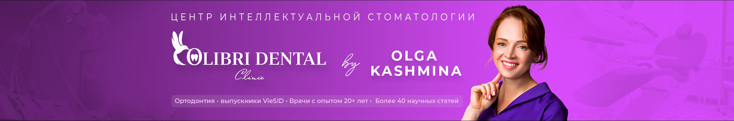 Я, Ольга Кашмина, основатель и главный врач центра интеллектуальной стоматологии «Colibri Dental Clinic» в Москве. Более 20 лет я помогаю пациентам обрести здоровую и красивую улыбку.