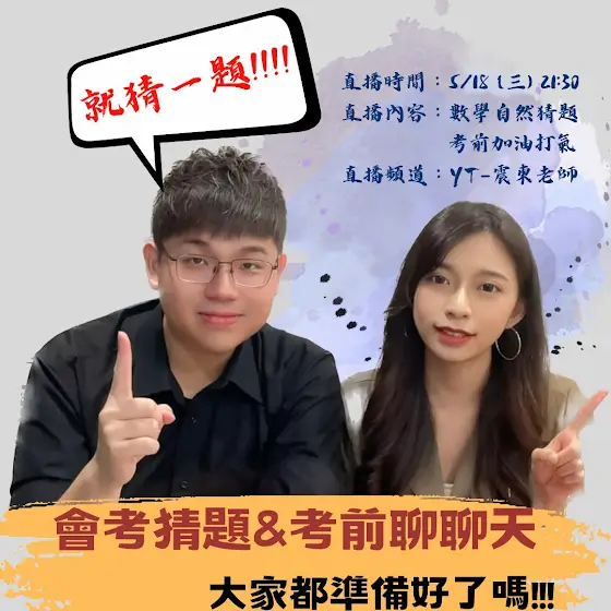 各位國三的孩子辛苦了!整個學期都在模考跟段考中夾殺中度過!我跟禹臻老師百忙之中騰出1hr來幫大家段考急救一下!今天晚上8:30-9:30直播國三數學強烈建議大家把時間空出來參加喔!