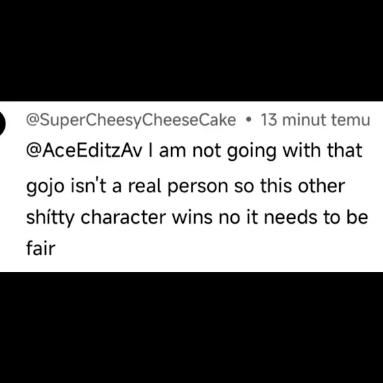 This made me realize that JJK fans are crazy to an extent to insult a person they don't even know for their character losing in an edit... I deeply apologize @NotTheAvery and in the future I won't make any more vs edits with you, only normal edits, again sorry 💜