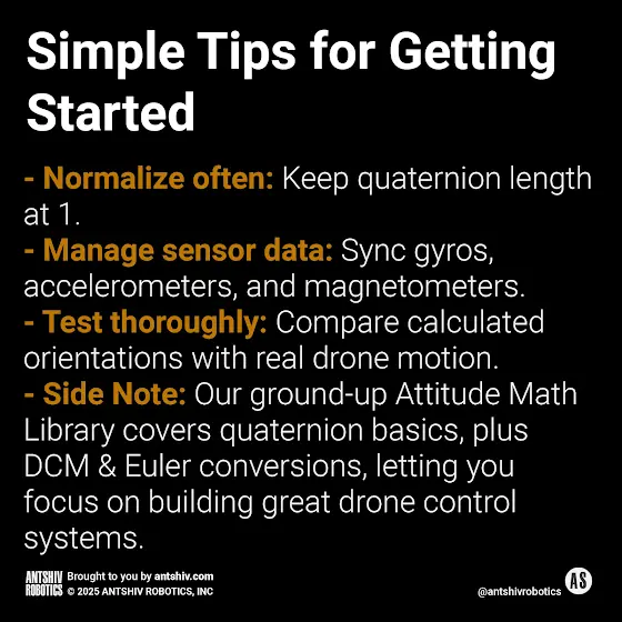 That’s the big picture on why quaternions matter. They’re mathematically robust, keep drone orientation data reliable, and integrate well with sensor fusion frameworks. If you’re curious to try them out, feel free to explore my libraries and see how they fit into your own projects. 🚀