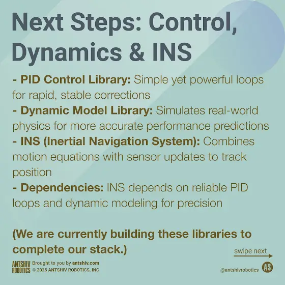 Once we have the dynamic model and control library in place, we’ll be ready to develop a **full‐featured INS (Inertial Navigation System)**. INS takes state estimation a step further by integrating velocity and acceleration over time to figure out precise positions. Since it relies heavily on real‐time corrections from the PID loops and accurate dynamic modeling, there’s a clear dependency chain: get your controls nailed down, then build your INS on top of that. The end result should be a flight controller that can not only hover with confidence but also navigate complex paths with minimum drift. #INS #Autonomy