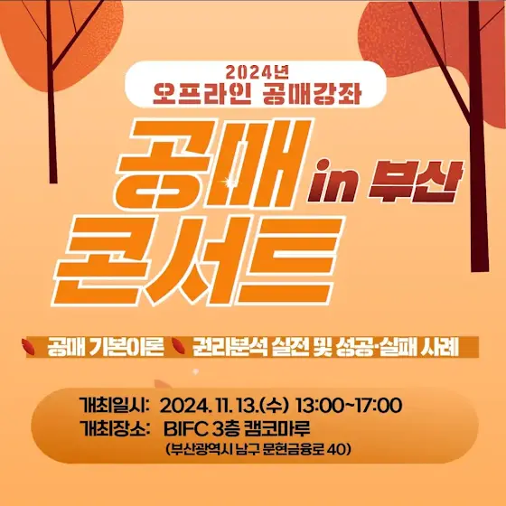 안녕하세요 동대표 임동섭 대표 입니다. 이번에 부산에서 공매콘서트를 진행 합니다. 공매 기본 이론과 실전기술 그리고 권리분석 까지 다양한 내용으로 구성 하였으니 많은 관심 부탁드립니다😀