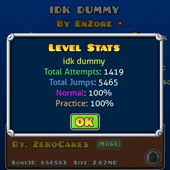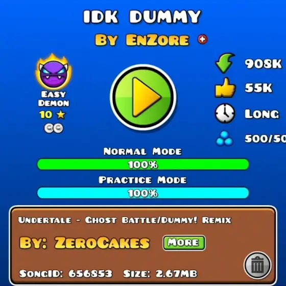 Demon thứ: 31Name Level: idk dummyAttempts: 1419Ngày Beat: 4/12/2025Đánh giá điểm: 10/10Level rất vui, nhạc remix cũng hay luôn:)