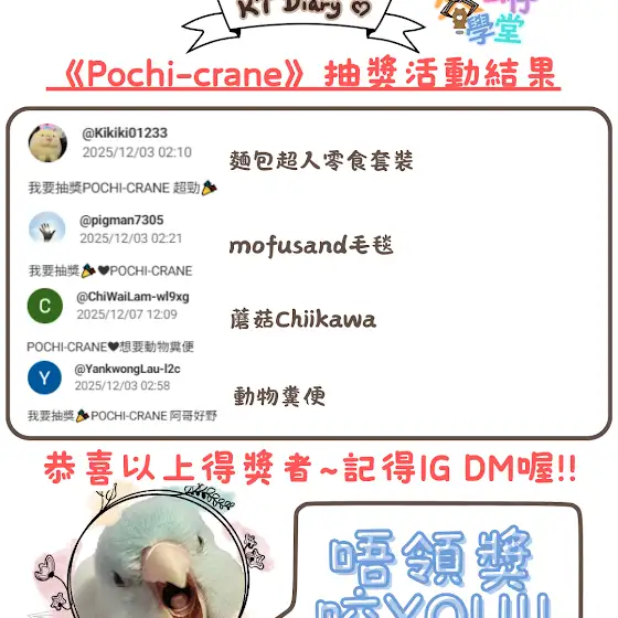 《Pochi-crane》抽獎活動結果公佈 !! 🎉🎊