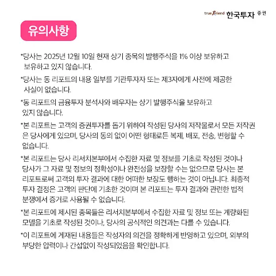 *당사는 2025년 11월 12일 현재 상기 종목의 발행주식을 1% 이상 보유하고 보유하고 있지 않습니다. *당사는 동 리포트의 내용 일부를 기관투자자 또는 제3자에게 사전에 제공한 사실이 없습니다. *동 리포트의 금융투자 분석사와 배우자는 상기 발행주식을 보유하고 있지 않습니다. *본 리포트는 고객의 증권투자를 돕기 위하여 작성된 당사의 저작물로서 모든 저작권 은 당사에게 있으며, 당사의 동의 없이 어떤 형태로든 복제, 배포, 전송, 변형할 수 없습니다. *본 리포트는 당사 리서치본부에서 수집한 자료 및 정보를 기초로 작성된 것이나 당사가 그 자료 및 정보의 정확성이나 완전성을 보장할 수는 없으므로 당사는 본 리포트로써 고객의 투자 결과에 대한 어떠한 보장도 행하는 것이 아닙니다. 최종적 투자 결정은 고객의 판단에 기초한 것이며 본 리포트는 투자 결과와 관련한 법적 분쟁에서 증거로 사용될 수 없습니다. *본 리포트에 제시된 종목들은 리서치본부에서 수집한 자료 및 정보 또는 계량화된 모델을 기초로 작성된 것이나, 당사의 공식적인 의견과는 다를 수 있습니다. *이 리포트에 게재된 내용들은 작성자의 의견을 정확하게 반영하고 있으며, 외부의 부당한 압력이나 간섭없이 작성되었음을 확인합니다.