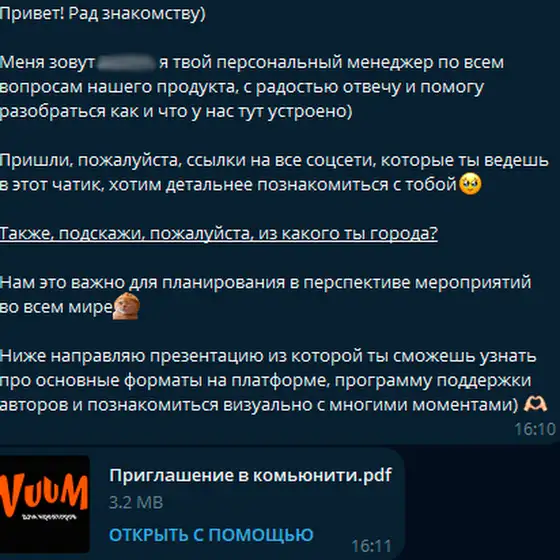 В конце октября мне в паблик ВК написала менеджер платформы уже с прямым предложением вступить в сообщество. Меня это изначально ввело в смятение. Потому что с тех пор я крайне слабо вырос в подписчиках. Спустя недолгой переписки, меня перевели в отдельный тг-чат c ЛИЧНЫМ комьюнити-менеджером. Он должен был помогать осваиваться и что-то там ещё. Спросили где я нахожусь, потому что у них планируются сходки и все такое. В теории - крутой способ встретиться вживую с другими креаторами и завести новые знакомства в этой среде. В первых сообщениях - море заботы. Меня попросили скинуть ещё раз все свои ссылки и... И все. Середина февраля. Реакции - 0.
