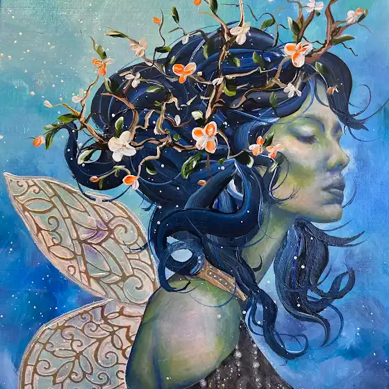 New artwork on the table for me... "Lunaria" - This forested faiery carries rhe quiet strength of branches and the moon... 14x16 Mixed media on wood canvas. Available - DM me! @highlight