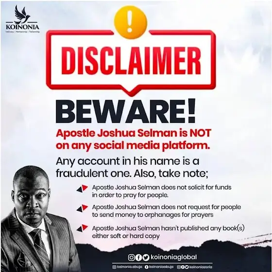 In light of incessant dubiousness by fraudulent individuals, we are obliged to continually remind you to beware of scammers who are impersonating Apostle Joshua Selman and/or the ministry.