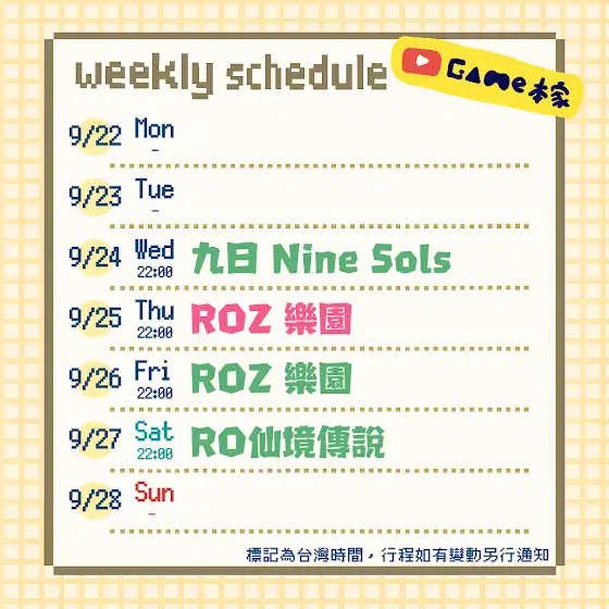 📅本週預計直播行程📅 9/17(三):九日⛄ 9/18(四):ROZ仙境傳說:樂園🐰 9/19(五):ROZ仙境傳說:樂園 🐰 9/20(六):RO仙境傳說🐰 ⌚時間如有變更會再通知~ ⛄=銀雪視角 🐰=瑪迷視角