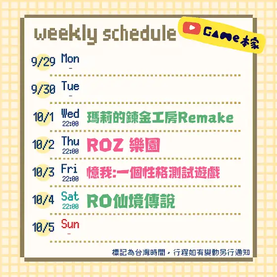 📅本週預計直播行程📅 9/10(三):九日⛄ 9/11(四):ROZ仙境傳說:樂園🐰 9/12(五):ROZ仙境傳說:樂園 🐰 9/13(六):RO仙境傳說🐰 ⌚時間如有變更會再通知~ ⛄=銀雪視角 🐰=瑪迷視角