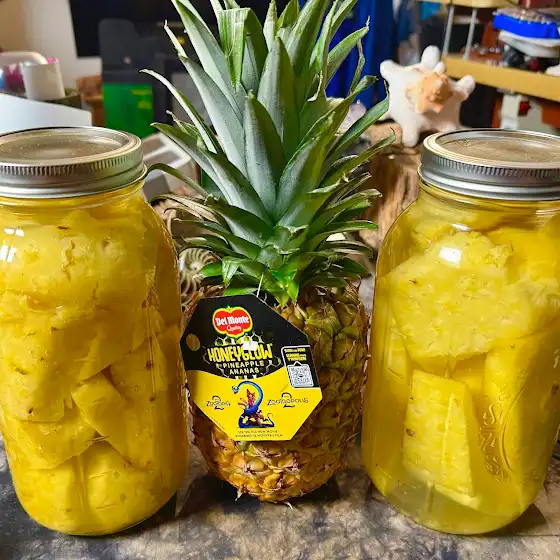 I practice what I actually ‘preach’ & your/my grandparents were RIGHT! In just the past hour or more I’ve canned 6 giant jars of very sweet IN SEASON pineapples. Each jar holds two large pineapples along with the preservative ‘fermented potato squeezings’; insert a laugh! In season fruit is very cheap, but how to keep it? My local grocery has these pineapples 3 for $5, or basically $1.65 each, the large jar is about $3 and $3 worth of HIGH-OCTANE “tater juice”. So that’s $9 each my cost for a very LARGE jar of soaking super sweet pineapples!