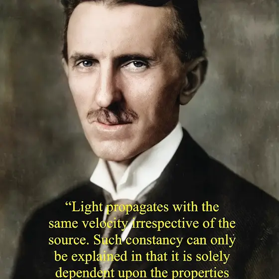 “Light propagates with the same velocity irrespective of the source. Such constancy can only be explained in that it is solely dependent upon the properties of the medium (the Aether), especially its density ^ elasticity”- Tesla