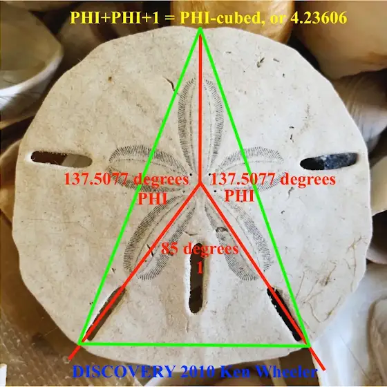The divine angle of growth, which is the lowest pressure for growth, is 137.5 degrees. The angle of the One is 85 degrees. 85 times Phi = 137.5 degrees. Phi cubed times 85 is 360 degrees. 85 degrees is the secret angle of the divine unknown to humanity. 108-36-36 are the divine angles of the cosmic logos. Golden angle can also be expressed by 360 x (Phi^-2) .381966 = 137.5degree angle.
