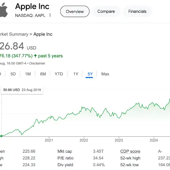 Пʼять років тому 1 акція Apple коштувала $50.66. Якби ви купили 99 акцій Apple на суму $5,000 тоді і тримали б їх в портфелі, то зараз мали б капітал 🔥 $17,400. Це більше на 348% за початкову суму вкладень.